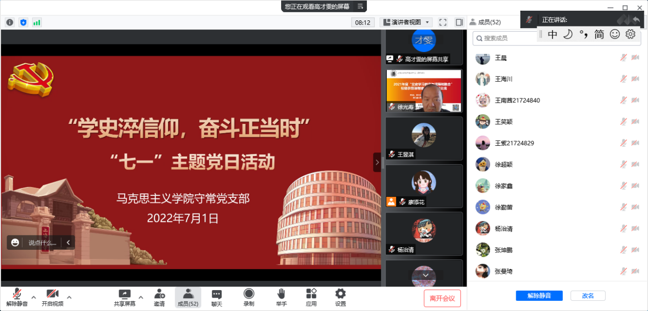 2022年7月1日上午9时,det365登录网站守常党支部开展“学史淬信仰,奋斗正当时”七一主题党日活动,活动旨在促进支部成员学习守常先生建党思想,继承和弘扬先辈遗志,弘扬伟大建党精神,充分发挥马院学子的使命担当。本次活动由守常党支部书记高才雯主持。