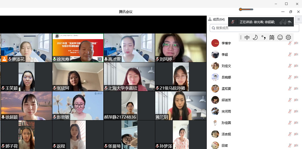 此外,徐光寿教授就学术研究与论文写作方面对同学们提了四点指导建议:一是要坚持文献研究法与比较研究法相结合,要全面使用资料、使用一手资料、梳理筛选资料,并基于资料进行充分、全面的比较研究;二是要遵循论证的路径,利用现有资料,有逻辑地论证观点,得出结论;三是要加强论文摘要的写作练习,学会在摘要中清晰地展现论文的观点与创新性;四是要坚持党性与科学性的统一,强调党性是灵魂,科学性是根本。勉励马院学子要继承好上大的优良学风,在导师的指导下做好研究,提高研究水平,开阔研究视野,掌握科学研究方法。 讲座结束后,守常党支部成员王笑颖、赵慧敏、彭思敏就此次主题党日活动发表感言。 王笑颖认为,在此次讲座中,自己不仅对李大钊在建党过程中的贡献有了更清晰的认识,对“守常精神”有了更深刻的感悟,还进一步了解到作为研究生应该掌握的学术研究方法。她表示深受启发,决心“以后专注于历史文献的阅读,丰富自身的知识体系”。 赵慧敏亦从自身党史党建专业方向出发,就“政党”一词发表了自己的见解,她认为在新时代的今天,我们作为马理论专业的研究生,在建党101周年的历史之际,更要深入学习和感悟伟大建党精神,将所学知识应用到学理性实践中。 彭思敏借此机会,就“党的初心”和“李大钊先生的初心”两者之间的关系,以及党员同志如何坚守初心两个问题向徐光寿教授进行了求教。对此,徐光寿教授回答道:“伟大建党精神产生于中国共产党的创建过程中,而中国共产党的创始人则是伟大建党精神的贡献者和践行者。李大钊作为党的主要创始人之一,亦是‘党的初心’的贡献者、践行者与坚定者。”关于党员同志如何守初心的问题,徐光寿教授指出,首先要坚持学习党史,充实党史知识背景,了解“初心”是什么;其次要在实践中践行、落实“初心”,坚持从“学”到“行”,“学”“行”结合。