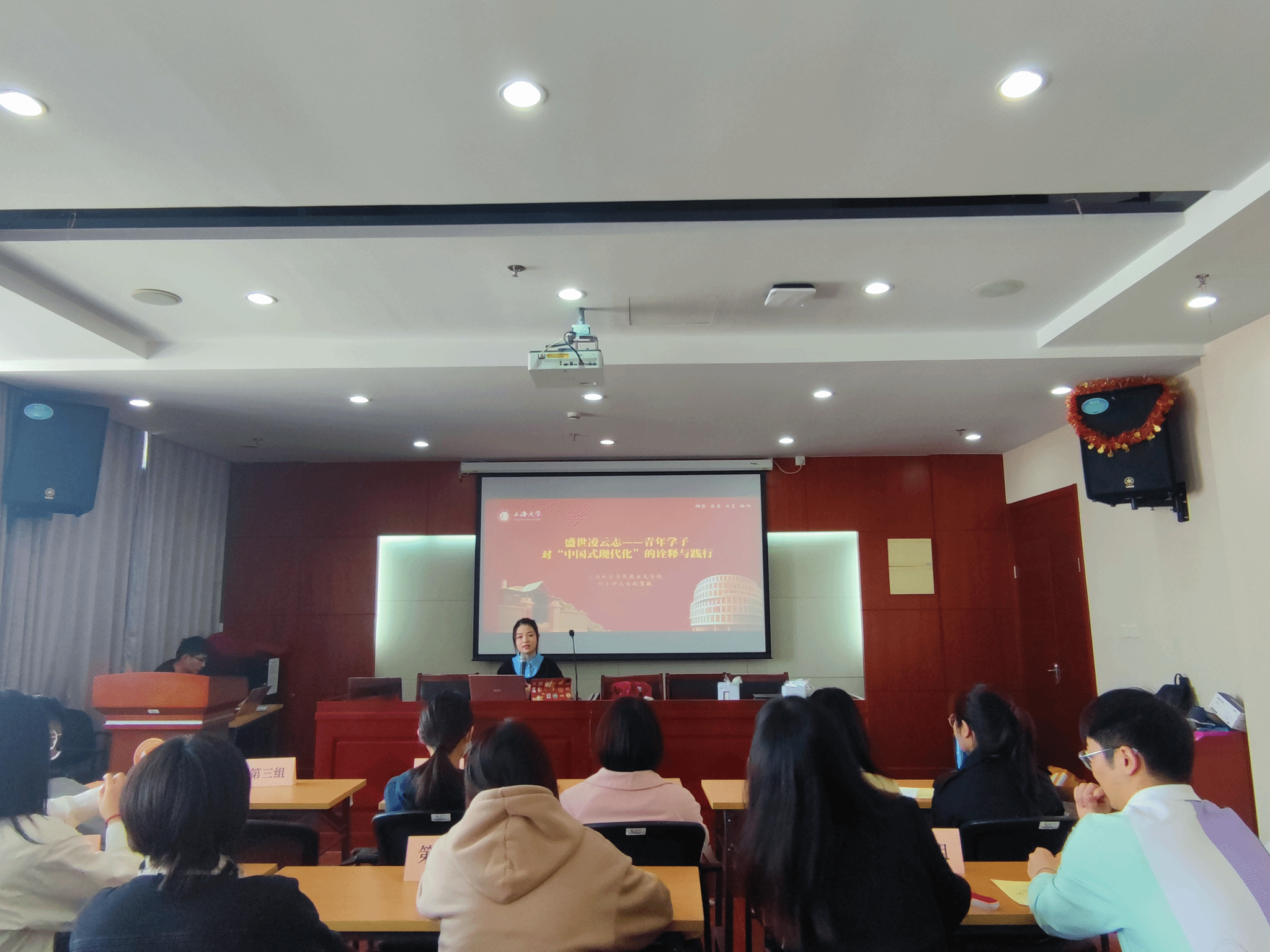 2022年11月18日,det365登录网站全体学生党员参与了党的二十大精神专题学习会暨教职工政治理论学习会,本次学习会邀请上海市党的二十大精神专家宣讲团成员、det365登录网站副院长高立伟教授做题为“以中国式现代化全面推进中华民族伟大复兴——深入学习贯彻党的二十大精神”的辅导报告。结束后,党委书记王国建寄语全体马院师生要坚持“马院姓马、在马言马”的鲜明导向,推进党的二十大精神学习走深走实、入脑入心,坚持理论联系实际,将自身使命与时代大势相结合,为全面建设社会主义现代化国家贡献力量。