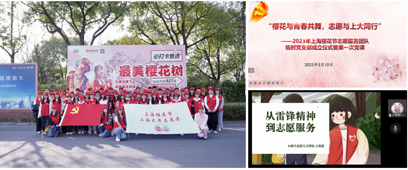 樱花共舞青春,彰显志愿本色 为更好地发挥学生党员在上海樱花节志愿活动中的先锋模范作用,让“党旗红”携手“志愿蓝”,展现上大学子的责任与担当。3月10日,“樱花与青春共舞,志愿与上大同行”2023年上海樱花节上海大学志愿者团队临时党支部成立仪式暨“让青春发光,与志愿同行”主题党课顺利召开。上海樱花节上海大学志愿者团队的93名党员参会,会议由临时党支部书记高才雯主持。本次上海樱花节志愿活动极大地提升了党员同志们对志愿服务的认知,激发了志愿服务热情。在志愿活动中,临时党支部以党建为引领,发挥战斗堡垒作用,号召每一位党员志愿者积极投入志愿活动,以初心彰显先锋本色,忠于职守、扎实奉献,书写无愧于青年时代的精彩华章。