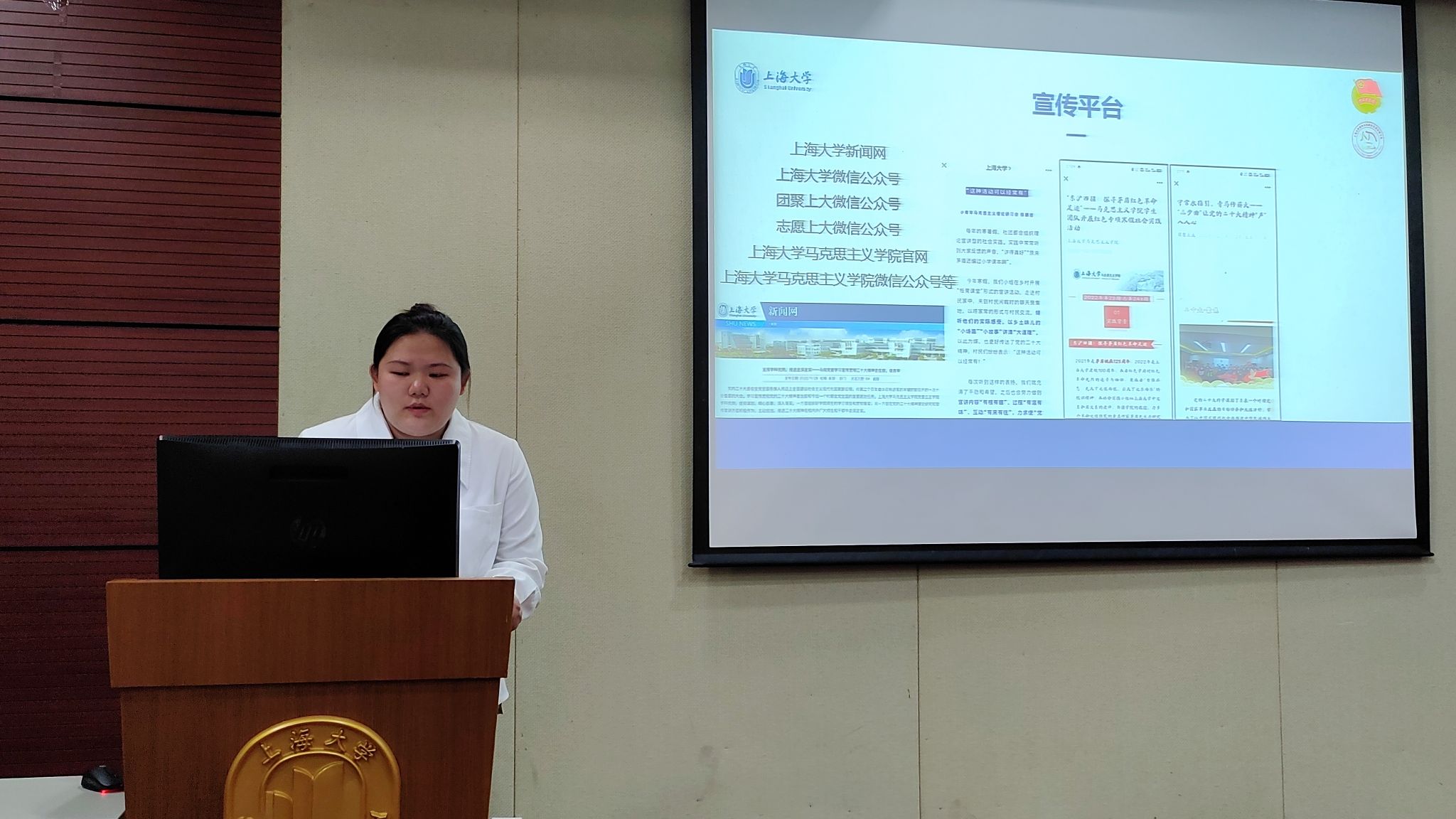第六届青马研习会主席团成员陈鹏吉从“社团建设”、“社团活动”、“荣誉”等方面对2022~2023年青马研习会的工作进行了全面总结。陈鹏吉先是带领大家回顾了社团的理念、宗旨、定位、架构、标识等社团基础信息,随后她依次介绍了青马研习会在过去一年内所组织举办的各项活动,从“党的二十大精神宣讲团”的成立及校内外宣讲,到赴湖州市安吉余村、德清五四村等红色调研,以及真理的力量——纪念马克思诞辰200周年主题展等,作为“2022年度上海高校活力社团”与“2022年度上海大学优秀社团”,她坚信,青马研习会将始终以“踔厉奋发、挺膺担当”的良好精神风貌大步前行。