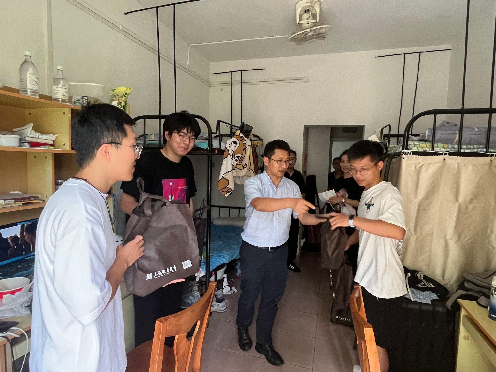 走访宿舍时,学院老师与同学们亲切交谈,了解新生入学后的学习生活情况、假期安排等。学院党委书记王国建为同学们逐一赠上节日礼包,勉励同学们珍惜时光、奋发有为。此外,他也提醒部分同学假期返乡注意安全,留校同学多和亲人联络,以解思乡之情。
