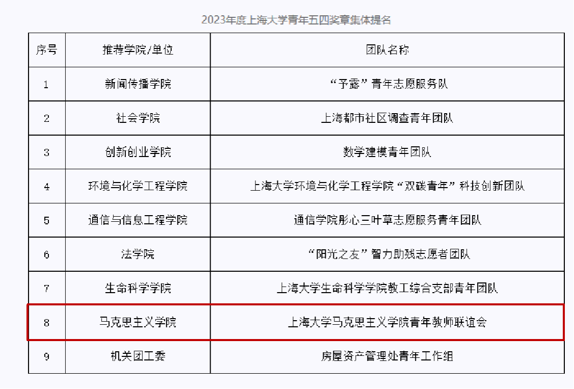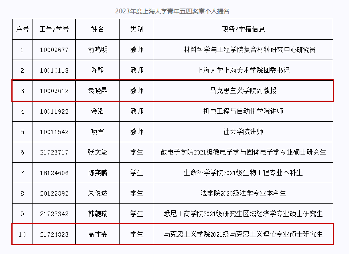 12月22日,根据《关于评选2023年度上海大学青年五四奖章的通知》,经各二级团组织推荐、候选人答辩、专家评审,上海大学五四青年奖章获得者及提名结果产生并公示。我院马克思主义基本原理教研部主任袁晓晶、2020级马克思主义理论专业硕士研究生高才雯获“2023年度上海大学青年五四奖章个人提名”,det365登录网站青年教师联谊会获“2023年度上海大学青年五四奖章集体提名”。