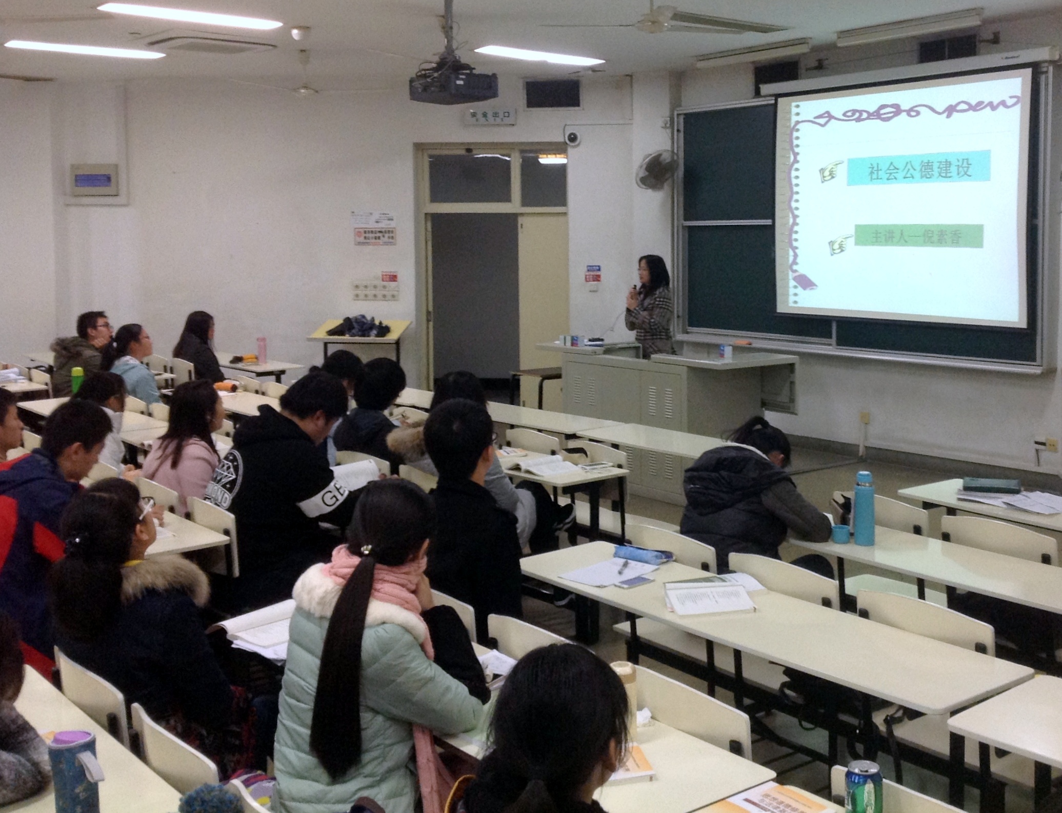 2015年12月10日晚,我院"推进本科教学教师激励计划 进一步提升本科教学质量"活动月又迎来一位嘉宾——湖北省伦理学会副会长、武汉大学生命伦理研究中心副主任、武汉大学中外德育研究中心副主任、武汉大学det365登录网站思想政治教育系系主任倪素香教授。在CJ107教室"思想道德修养与法律基础"课课堂,倪老师围绕"加强社会公德建设"这一专题进行讲解,并与现场近百名师生热烈互动。 (奚建群 供稿) |