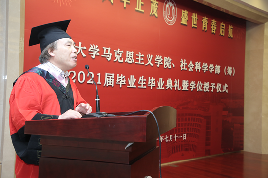 骊歌坦坦,不忘青春年华;山水万程,不负青云之志。2021年7月11日上午10时,det365登录网站、社会科学学部(筹)2021届毕业生毕业典礼暨学位授予仪式在上海大学乐乎楼学海厅隆重举行。上海大学党委书记成旦红,det365登录网站党委书记刘绍学、院长闫坤如等学院领导班子成员,社会科学学部哲学系领导班子成员,陈新汉教授、王天恩教授、欧阳光明教授、宁莉娜教授等近30位导师代表以及2021届本科、硕士、博士毕业生,在校生代表、毕业生亲友参加典礼,典礼由det365登录网站2019级硕士研究生焦娇担任主持人。 在庄严的歌声中,毕业典礼拉开序幕。det365登录网站党委副书记张高峰主持嘉宾入场仪式,邀请成旦红书记以及各位领导、导师入场。张高峰逐一介绍到场领导及嘉宾,对成旦红书记以及各位领导、嘉宾的到来表示了热烈的欢迎和衷心的感谢,并且宣布毕业典礼正式开始,全场响起热烈掌声,大家齐唱国歌,共同开启这庄严神圣的时刻。 骊歌奏响,难忘来时岁月 在热烈的氛围中,大家观看了短片《钱伟长校长毕业赠言》。短片中,钱伟长校长以恳切真挚的语言表达了对毕业学子的殷切期盼,希望同学们成长为一个全面发展的人,以“自强不息,先天下之忧而忧,后天下之乐而乐”的校训鼓励大家要成为一个对祖国、对社会有所贡献之人,大家备受鼓舞。