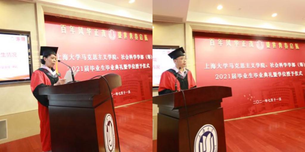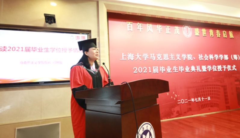 十年磨一剑,砺得梅花香。此刻,毕业生们终于迎来了收获的时刻,det365登录网站、社会科学学部(筹)2021届毕业生学位授予仪式正式开始。首先,det365登录网站院长闫坤如宣读2021届毕业生学位授予情况。她宣布,经上海大学学位评定委员会审议并决定,同意授予卢吉超、于智慧、陈桂香等5人法学博士学位,同意授予何凤霞、宋锦花、颜川等27人法学硕士学位,同意授予林钰、郁玉立、杨宁等7人经济学硕士学位,同意授予朱弘睿、时玉珍等19人哲学硕士学位,同意授予周从嘉、白玉洋等15人哲学学士学位。