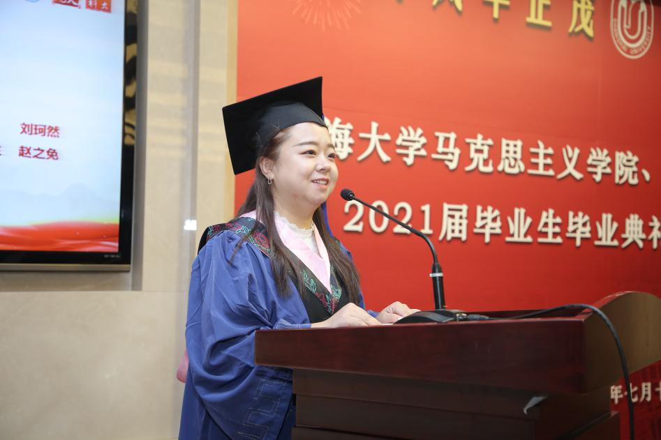 2021届马克思主义理论专业硕士毕业生、上海市优秀毕业生赵之免发言。她说从懵懂、迷茫到自信、成熟,从学习科研到工作生活,我们成长的每一步都会成为宝贵的精神财富。她相信,在马克思主义理论以及上海大学校训精神的指引下,坚持将理论学习与实践探索相结合,我们必将创造精彩人生。她借用习近平总书记“道阻且长、行则将至、行而不辍、未来可期”的讲话,表达了自己在进步中追逐青春理想的决心和勇气。发言结束后,毕业生代表向学院、学部赠送礼物。
