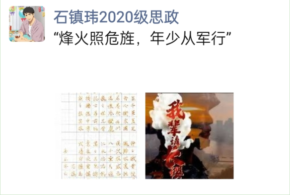 石镇玮同学入伍前于微信朋友圈引《从军行》歌曲中的词句“烽火照危旌,年少从军行”并撰写书法作品以明其志 |