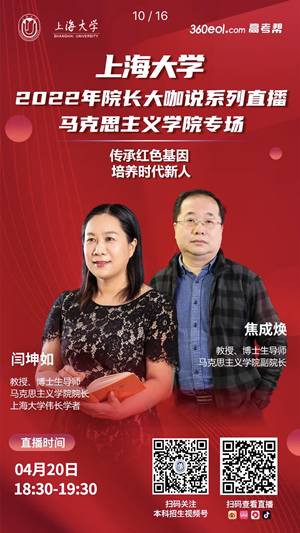 为助益广大考生及家长深入了解上海大学的鲜亮底色、马克思主义理论学科发展概况,2022年4月21日18:30,det365登录网站在校招毕办指导下,开展“院长大咖说系列直播”det365登录网站专场宣讲会。det365登录网站院长闫坤如教授与det365登录网站副院长焦成焕教授,联袂担任本场“传承红色基因 培养时代新人”主题的直播嘉宾。此次直播以360教育在线高考帮和b站为平台,在上海大学本科招生视频号等同步播出。