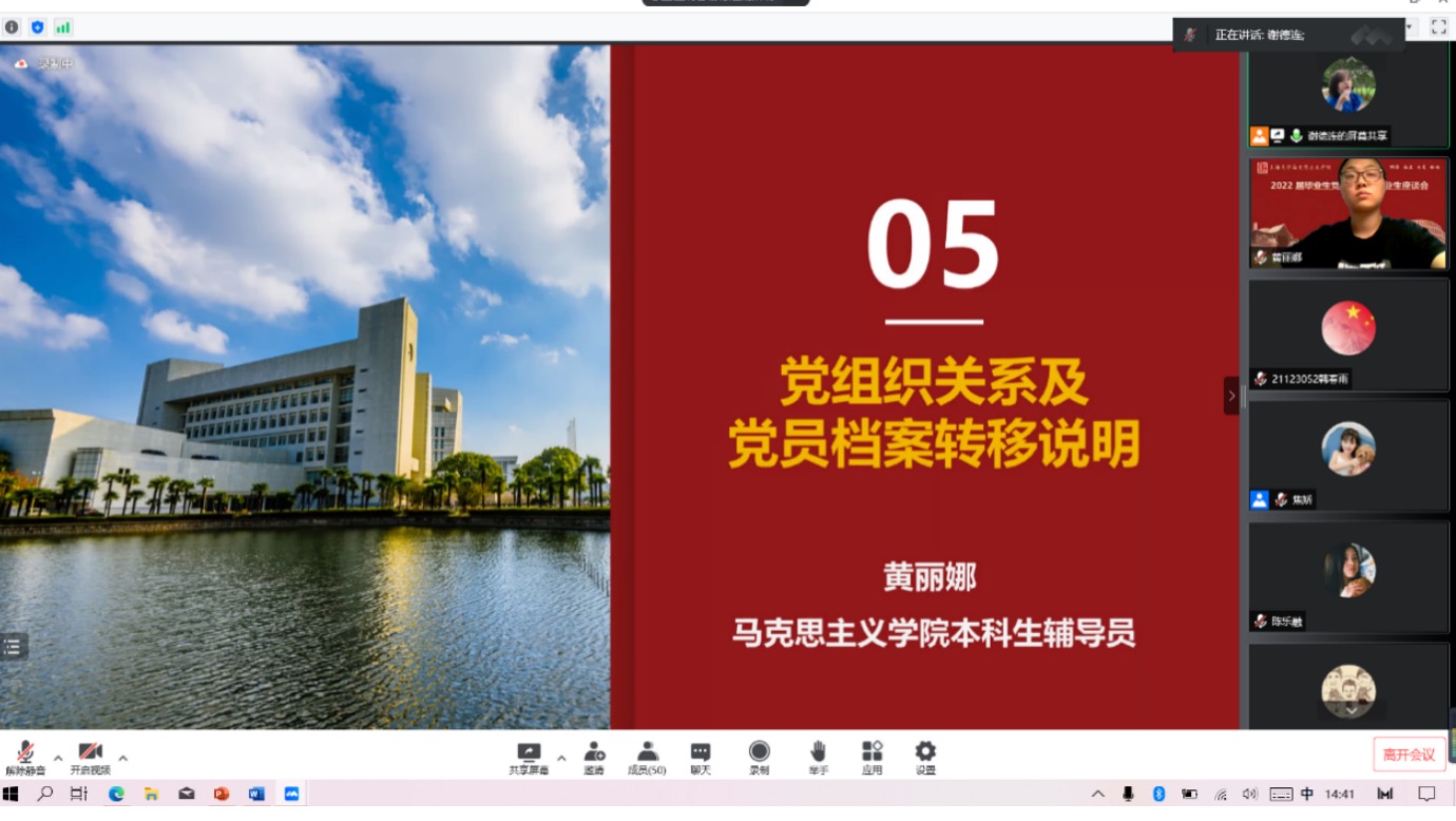 最后,学院本科生党支部书记、本科生辅导员黄丽娜为2022届毕业生党员介绍党组织关系及党员档案转移的相关事项。强调党组织关系及时转移的重要性和相关注意事项,提醒同学们要切实增强党性观念和组织观念,接受新单位和新的党组织教育管理,继续发挥党员先锋模范作用。研究生党建中心主任谢德连对相关事项做了补充说明。