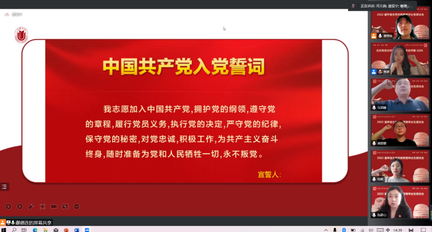 岁月不居,时节如流,又是一年毕业季。为引导和鼓励广大毕业生党员在学思践悟中踔厉奋发、不忘初心、牢记使命,不断增强“两个意识”、坚定“四个自信”、做到“两个维护”,以习近平新时代中国特色社会主义思想为指导,det365登录网站于6月24日线上举办主题为“逐梦新时代,奋进新征程,喜迎二十大”的2022届毕业生党员教育暨毕业座谈会。学院党委书记王国建,党委副书记、副院长张高峰,形势与政策教研室主任孙会岩,党委组织员吴琼,全体辅导员以及50余名2022届毕业生党员参与本次活动,会议由研究生党建中心主任谢德连主持。