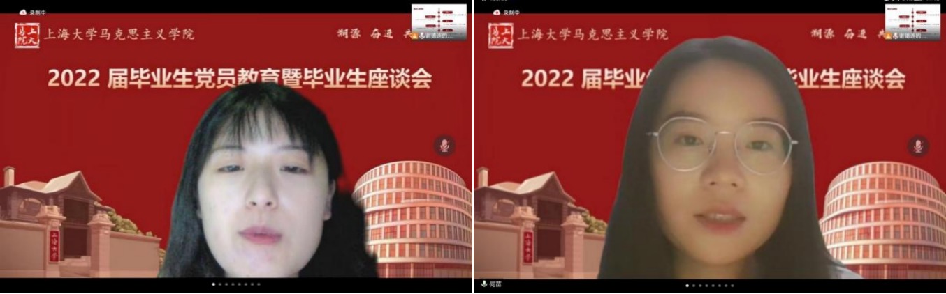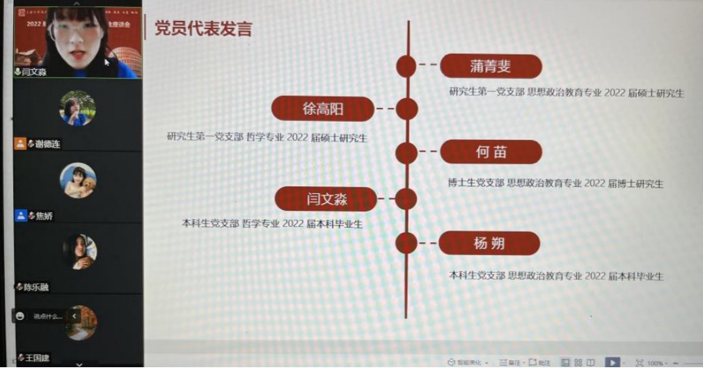 随后,研究生第一党支部2019级硕士研究生蒲菁斐、徐高阳,博士生党支部2019级博士研究生何苗,本科生党支部2018级本科生闫文淼、杨朔等五位同学作为2022届毕业生党员代表做发言交流。他们以一名共产党员的身份回顾在校学习期间的所思所感,表达了对学习科研的热爱,感谢党组织对自己的培养,感恩学校、学院、老师和同学们给予的帮助与关怀。他们表示,在新的人生旅途中仍会时刻牢记共产党员的初心使命,心系家国,学而不已,积极发挥党员的先锋模范作用,勇担时代重任。