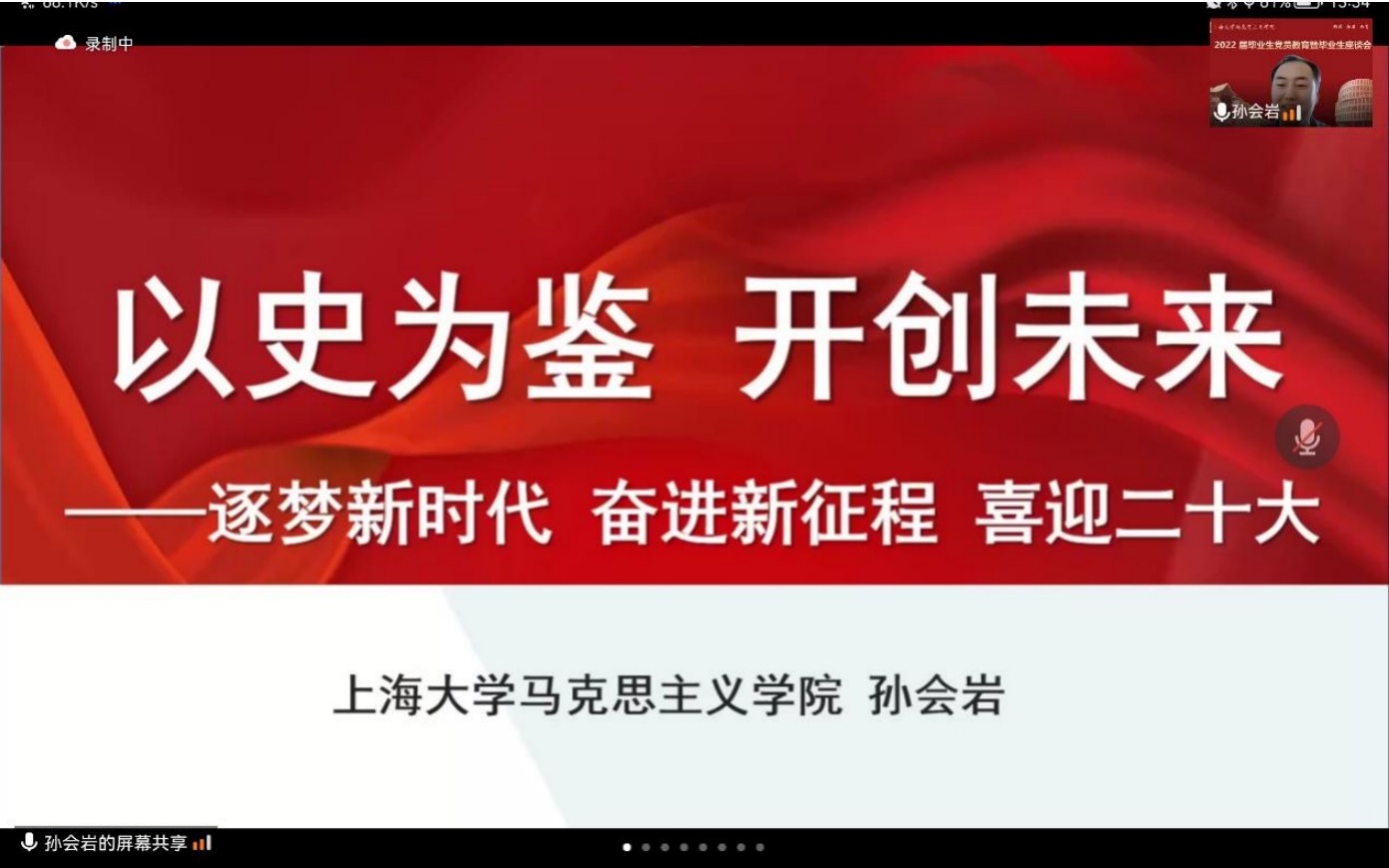 会议伊始,孙会岩副教授为毕业生党员带来“以史为鉴,开创未来”的主题党课。孙老师从唯物史观的视角出发,结合历史史实和革命先辈的相关事迹例举了三句俗语及三个如何看待历史、研究历史、评价历史的问题展开论述,启示同学们要树立正确的历史观与价值观,以史为鉴,开创更美好的未来,期望毕业生党员们在面向新的学习、踏入新的工作岗位后能多读书、多锻炼,学会总结过去,不断提升自我、充实自我、发展自我、超越自我。