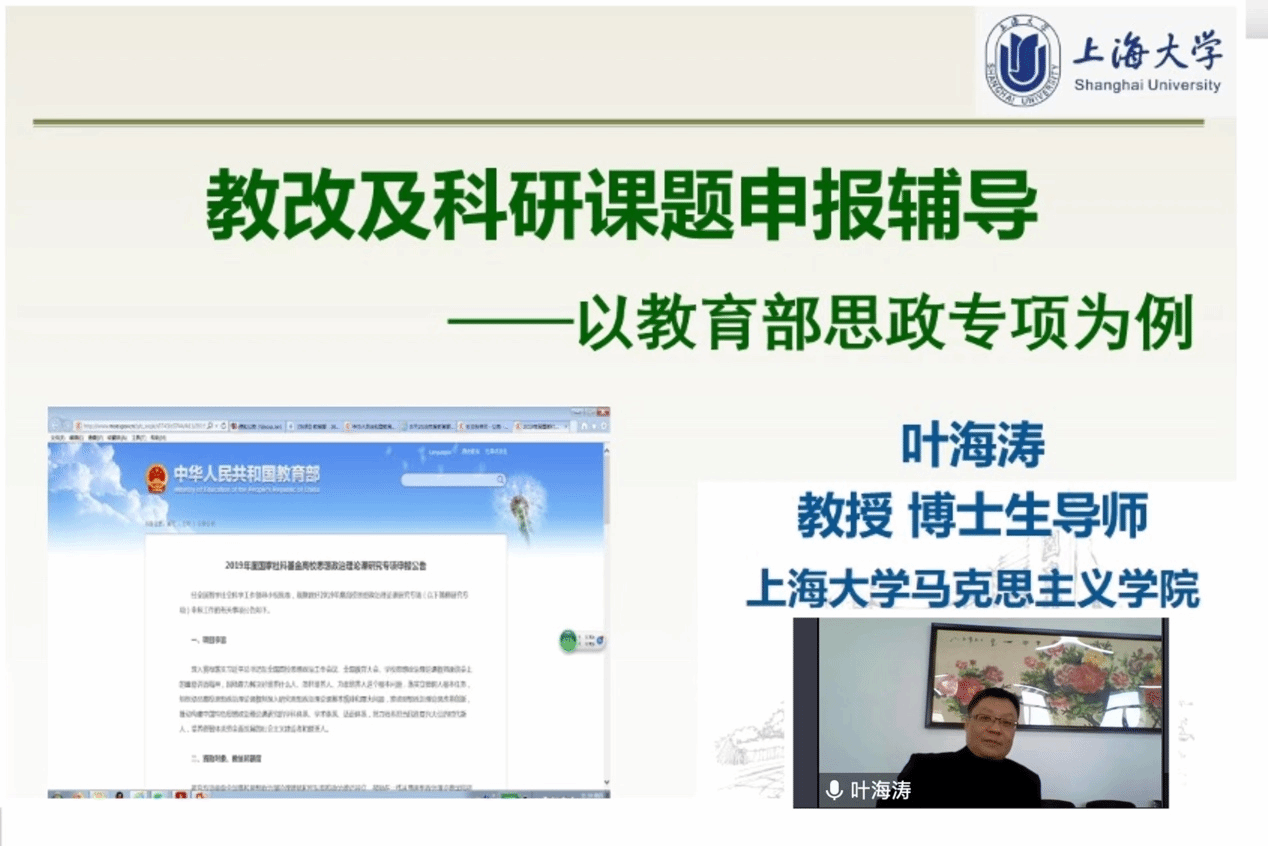 近期,全国高校正在组织申报各类国家级与省部级的科研、教改和教研项目,上海大学文科处已相继发布《2023年度教育部人文社会科学研究一般项目申报工作的通知》、《关于2023年度高校思想政治理论课教师研究专项一般项目申报工作的通知》等多项公告,要求相关院系的教师申请人根据自身的研究基础和教学特长,坚持正确政治方向、价值取向、研究导向,认真凝练主题,积极参与申报。为进一步推动学院相关课题申报工作的顺利展开,提高青年教师课题申报的技巧与方法,学院青年教师联合会(青联会)4月1日上午特邀det365登录网站主持工作副院长叶海涛教授在学院502会议室作专题报告,各位青年教师采取线上(腾讯会议)与线下相结合的方式参加了此次培训活动。 叶海涛教授通过“教改及科研课题申报辅导——以教育部思政专项为例”的报告,为学院青年教师详细讲解了教改与教研课题申报概述、思政专项课题类别、教育部思政教师专项申报,以及课题申报过程中需要注意的事项和细节。首先,通过概述教改与教研课题的申报环节,叶海涛教授列举了科研、教改和教研项目中的三个典型案例,着重强调了不同课题项目的侧重点与落脚点。然后,基于思政专项课题的要求,叶海涛教授全面解析了“2020年度高校思想政治理论课教师研究专项”的立项情况,并且结合今年的申报工作通知进一步剖析了四类高校思政课项目的申报难度、课题特点以及注意事项。最后,关于教育部思政教师专项申报,叶海涛教授要求申报者仔细阅读《申报通知》与《课题指南》,认真填写《申报书》与《活页》,熟悉整体设计,做到心中有数。 叶海涛教授的报告结束后,学院广大青年教师于线上和线下积极提问,针对课题项目申报中遇到的各种问题深入交流,并且纷纷表示在此次专题培训活动中受益匪浅,感谢叶海涛教授能将自身经验倾囊相授。学院青联会也将以此次专题培训活动为契机,努力解决青年教师在科研与教学上的迷思、困惑和难题,奋力加快青年教师在学院各项工作中的进步和成长。