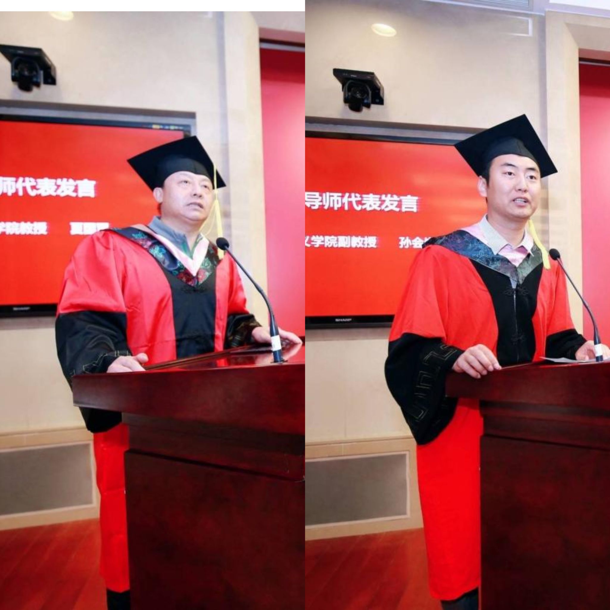 殷殷期许,催马奋蹄 导师代表夏国军教授、孙会岩副教授先后深情寄语。夏国军老师指出在上海大学的这段岁月将是毕业生们的一种宝贵财富,强调社会同样也是一座大学,要在社会的大学里乘风破浪,实现个人梦与国家梦的统一,成人成才。孙会岩老师在发言中为同学们送上了祝福与嘱托。他强调,要在复杂社会中找到自己的比较优势。牢记道路千万条,实践第一条的准则。同时加强锻炼身体,投资大脑。在面对社会的不确定性过程中,不断提升自身的确定性。