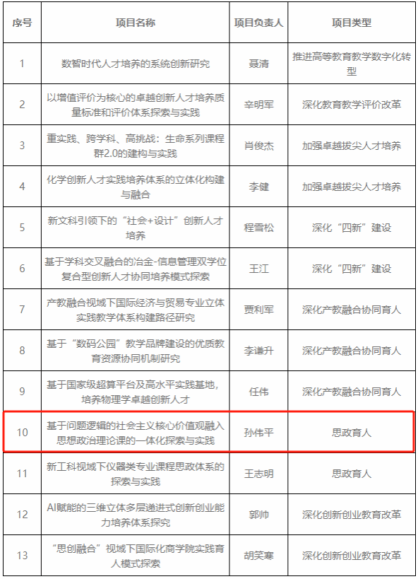 近日,上海市教育委员会下发《上海市教育委员会关于公布2023年上海高校本科重点教改项目立项名单的通知》(沪教委高【2023】47号),det365登录网站孙伟平教授申报的《基于问题逻辑的社会主义核心价值观融入思想政治理论课的一体化探索与实践》项目获得立项。此次上海大学共有13个项目获得立项,获批立项数位居上海市高校第三。