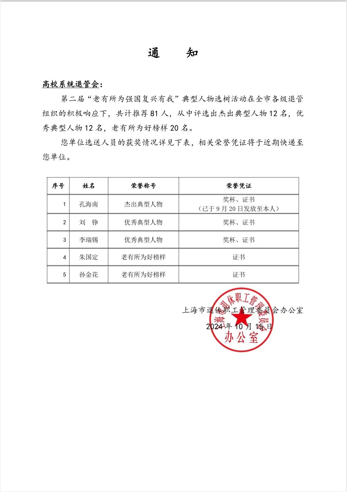 近日,上海市第二届“老有所为 强国复兴有我”典型人物选树名单揭晓。经全市各级退管组织的积极组织推荐、上海市退休职工管理委员会办公室评选,我校det365登录网站退休教师刘铮教授经由学校离退休工作处推荐在此评选中获得“‘老有所为 强国复兴有我’优秀典型人物”荣誉称号!